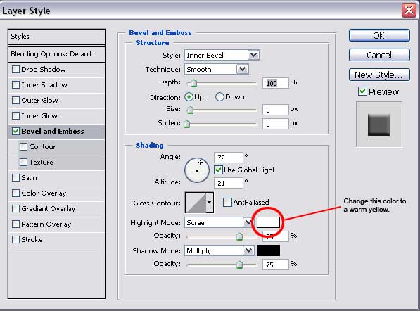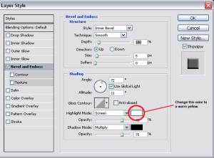 - Suh-Weet!!! Ok, last step is to give the main text a little dimension. Select your “Vacation Copy” text layer and go up to Layer > Layer Style > Bevel and Emboss. There are a lot of options in this window, so you can just go with the defaults if you want, but I would at least recommend you play with the shading “Angle” wheel in the center of the window. This changes the direction of the highlight that shows on the text. Move it around until it seems to be coming from the sunshine. You can also change the highlight color from white to a soft yellow light to match the sun’s color more closely.