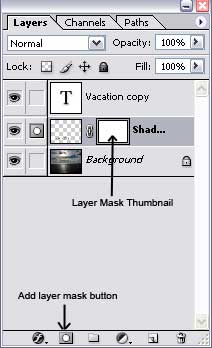 gradient tool (it may be hiding behind the paint bucket). Make sure you have a black foreground and white background color. In the upper information bar there is a preview of the gradient that should start with black on the left and fade to white on the right. Now click below the bottom edge of the reflected “Vacation” text and drag a line straight up to somewhere near the center of the reflected text. This will create a faded look to the Shadow! It may take a few tries to get it to look just right, so if you don’t like the way it looks at first undo the action and try again. (If you draw the gradient line at a slant, one side of the text will be faded more than the other…try holding the shift key as mentioned earlier!). It may take a couple tries to get it to look the way you want. The little white box mask thumbnail should now have a black area in the bottom. Finally, in the Layers window there is a box for “Opacity” in the upper-right. Click the right arrow on the side of this box and slide this down to a number somewhere around 85% (or just type that in)…whatever looks best to you. - Whew!! Awesome…now it’s really starting to look like there’s something going on here! Let’s give it a little ripple. First, click on the “Shadow” layer again