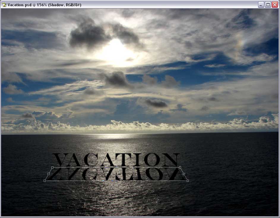change in the image though…because the duplicate copy is sitting exactly on top of the original. Double click the “Vacation” text layer in the layers window and rename it to “Shadow”. Next, go up to Edit in the top menu bar and select Transform > Flip Vertical. Now you suddenly have a jumbled mess of text. Good job!!! Go back to the move tool and then hold shift down and click and drag the text down until it lines up just underneath the upright version of the word. (Holding the shift key limits the movement of objects in either straight vertical, horizontal or 45 degree lines…try moving without holding shift and it will be much more difficult to line the text up). - Okay…starting to look like we might have some shadows going on. Let’s make it spread out a little as it moves away from the main text (this makes the shadow look more believable with the sun as a light source). First we are going to have to rasterize the text. Say Huh? Rasterize is Photoshop-eeze for “convert the text from editable text to a pixel image”. This has to be done in order to apply certain effects and filters to text, such as transformations (If you’re trying to apply a filter or transformation to text and Photoshop just doesn’t seem to want to let you do it, it’s probably because you need to do this rasterize thing). You cannot change the text once you do this so always make sure you have checked your spelling first!! To rasterize your text you can either right click the “Shadow” layer and then select Rasterize, or go up to the main menu bar and select Layer > Rasterize > Layer. Now with the “Shadow” layer still selected go to the main menu to select Edit > Transform > Perspective. A frame with small “control boxes” on the corners and sides will show up around the reflected text. Pick the lower left or right box and drag it sideways away from the center of the text.