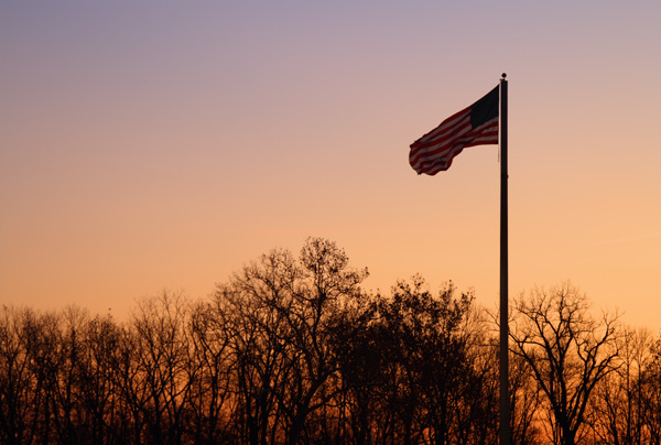 Well, it is late evening as I’m writing this but I wanted to share another really great sunrise. This time there were no clouds, just a nice golden glow in a clear sky that faded to a deep purple/blue. It was neat because I can see this flag from my back deck. I get to wake up and see these sunrises out my kitchen window and this morning just had a nice little treat. So I skipped breakfast and drove by on my way to work to get a shot. Nothing super special about the exposure, just slightly under-exposed (2/3 stop) to deepen the sky color and create more of a silhouette with the flag yet still have enough detail to see the stripes.