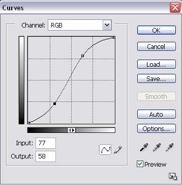 - Just to show off a little more of the power of layer masks, select the first Layer 1 image and let’s do a slight color enhancement to it. Go up to Image>Adjustments>Curves and slightly enhance the shadows and highlights. It’s ok if you’re not familiar with the curves dialog – I’ll go over that in more detail later – but for now just click in the upper right part of the line and pull it slightly higher and then click in the lower left section of the line and pull it slightly down until you have a curve that looks something like this.