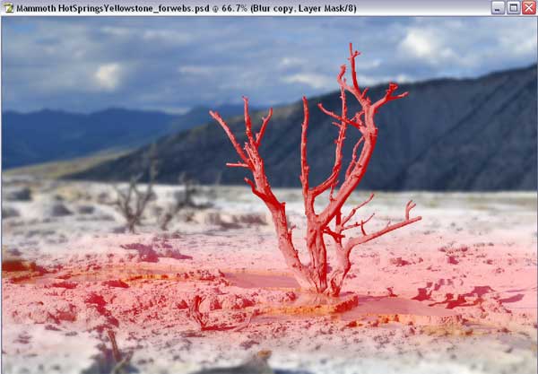 - You might be thinking that you’re not entirely sure if you’ve got something masked or not – well, Photoshop has a handy helper for that. Hit the backslash “\” key, just above the enter key. Your masked area will show up highlighted in red. If your image had a lot of red tones in it you could change this highlight color by double clicking on the layer mask thumbnail. Hitting the backslash key again will toggle the highlight off. I actually find it easier to mask off more than I need and then go back in with the white to unmask up to the edges of the tree. Once that is done I’ll go and clean up the rest of the mask. In this image you can see that there is a lot of “extra” mask (the red) but the edges of the tree have been cleaned up.