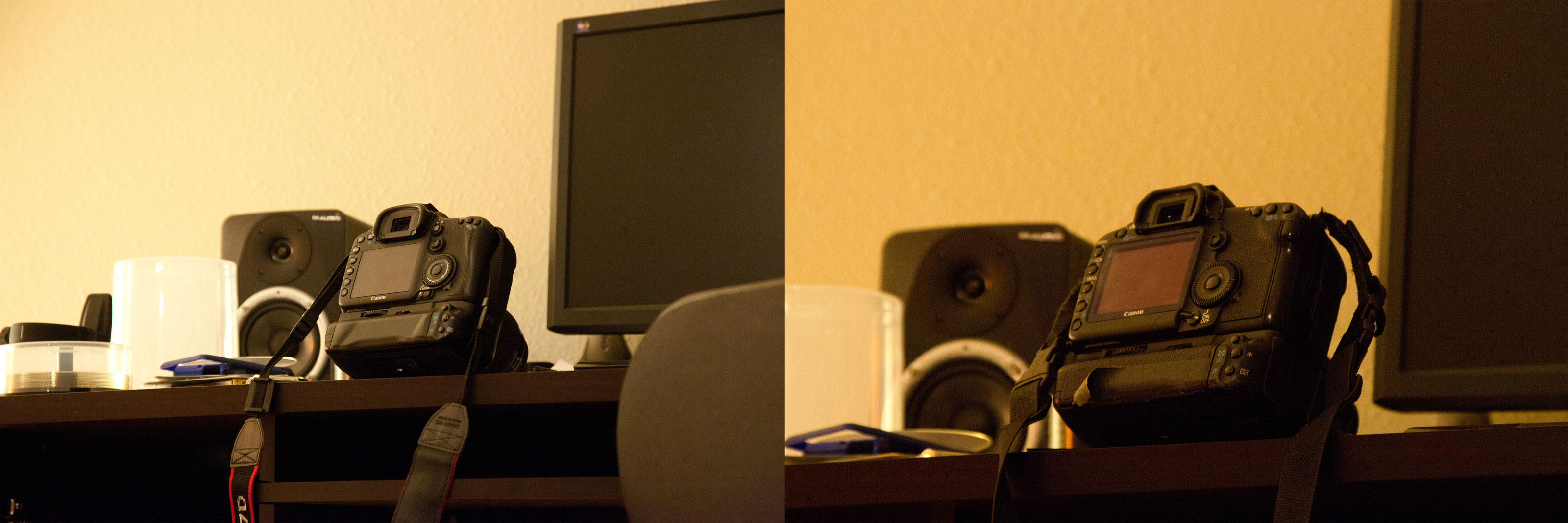 The image below shows a relative comparison of the zoom factor with the 7D’s crop sensor vs. the 5D mkII’s full frame. I shot the opposing camera body from the same location with the same lens at 6400 ISO.
